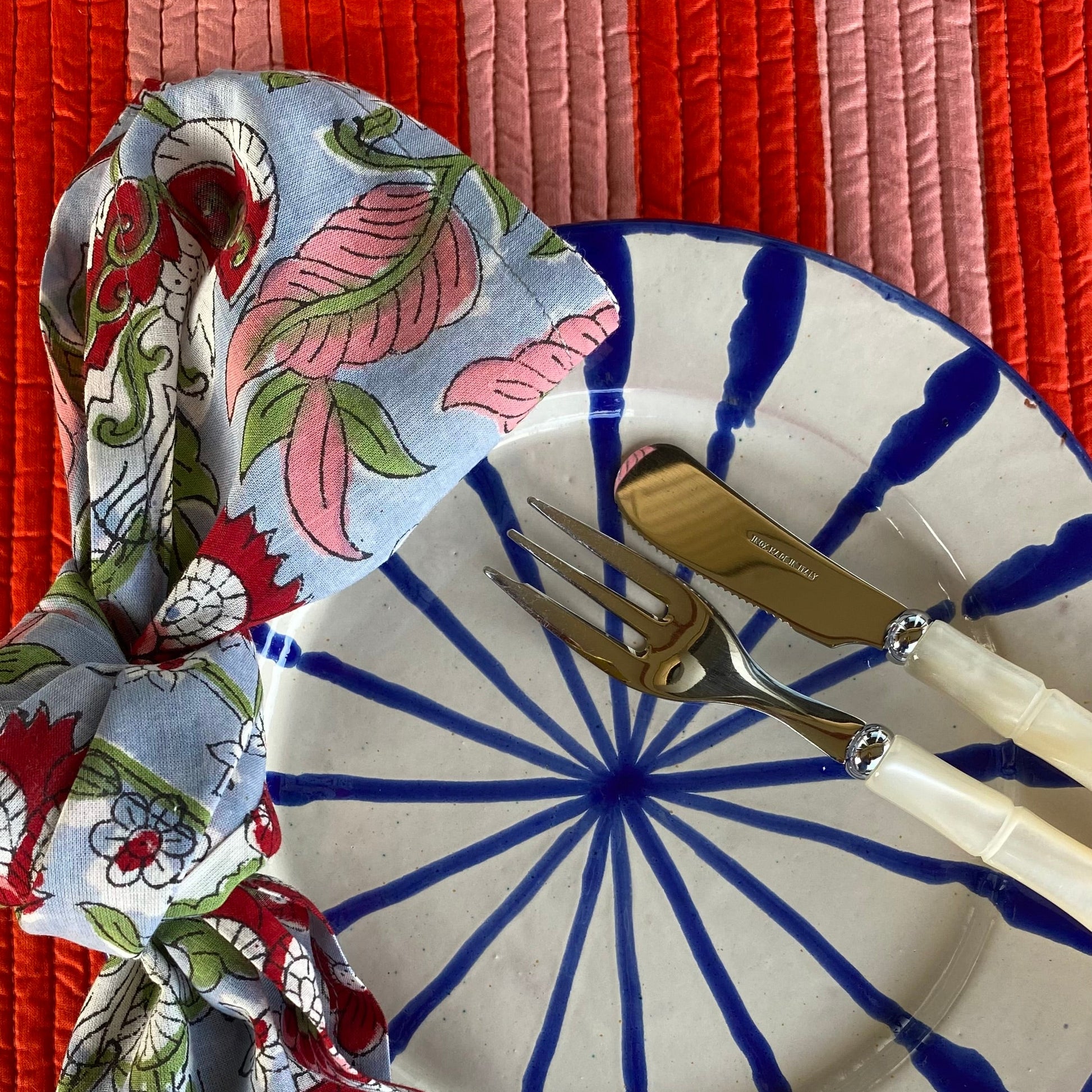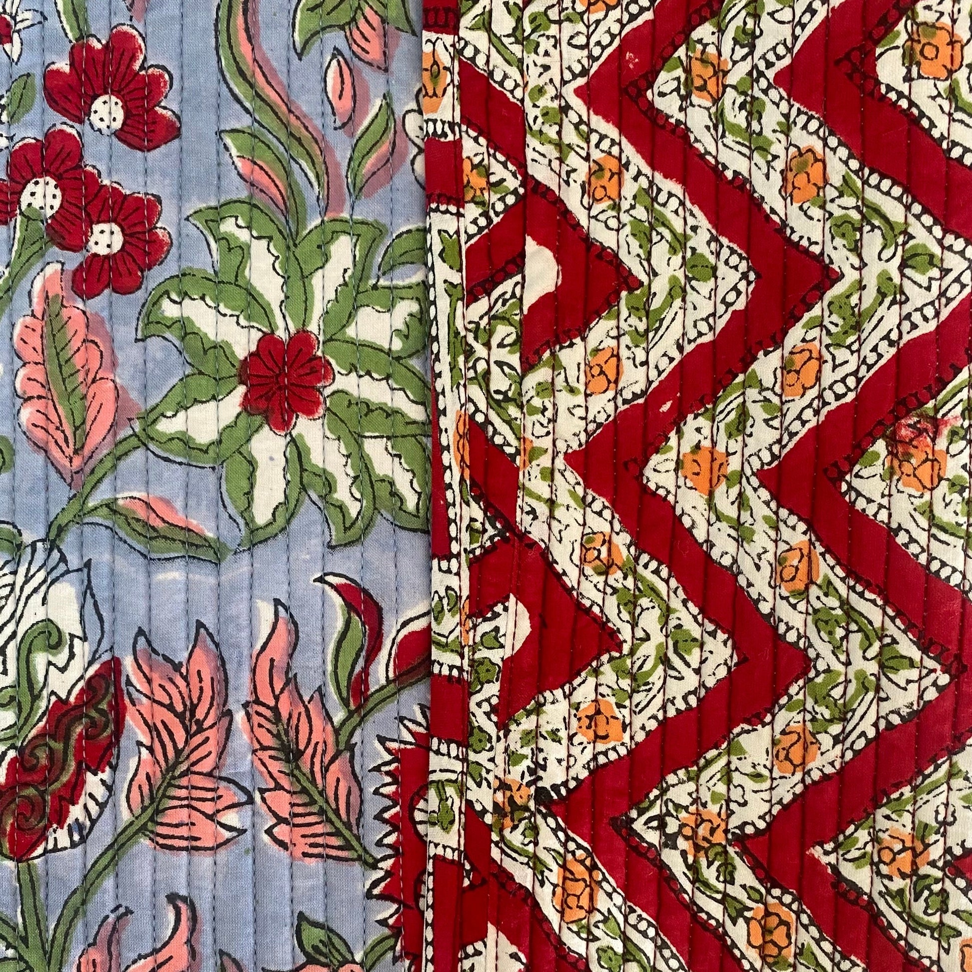 Combinación de prints romántico de flores guinda sobre fondo azul y zigzag de flores en guinda y naranja. Súper original!