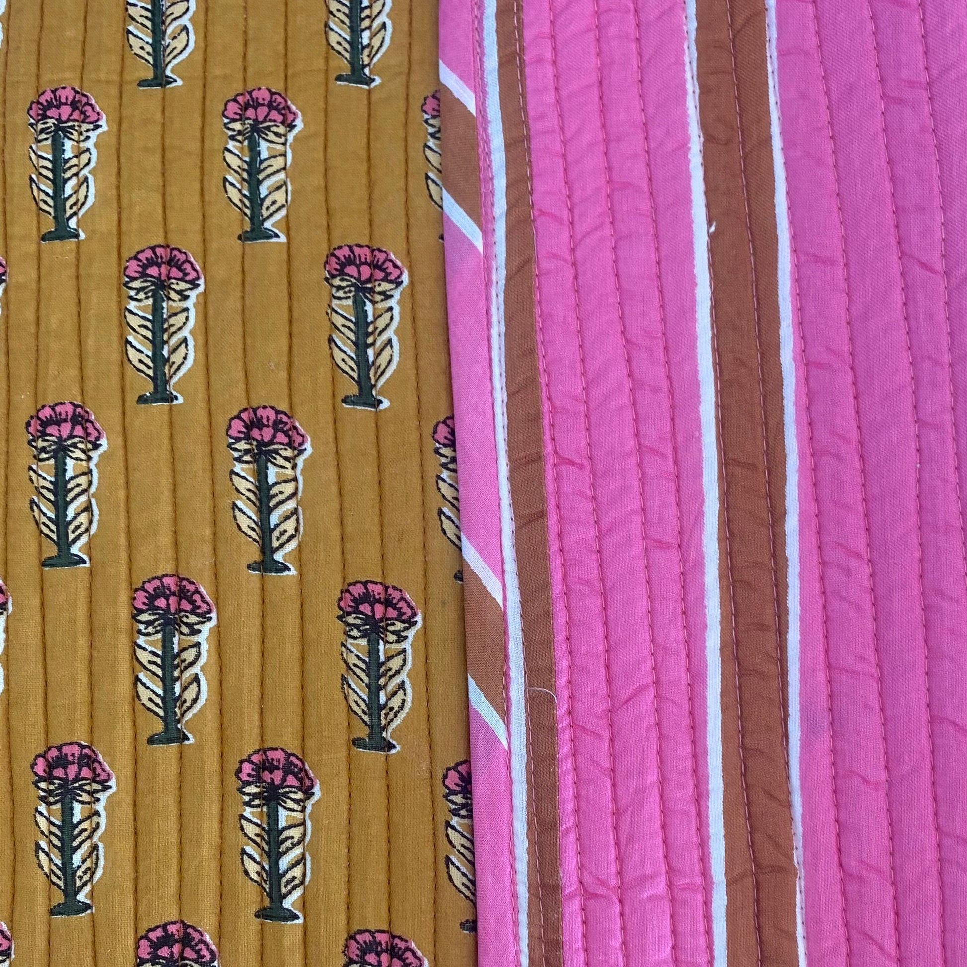 Combinación de prints romántico de flores rosa con fondo camel y rayas rosa y camel. No lo hay más romántico!