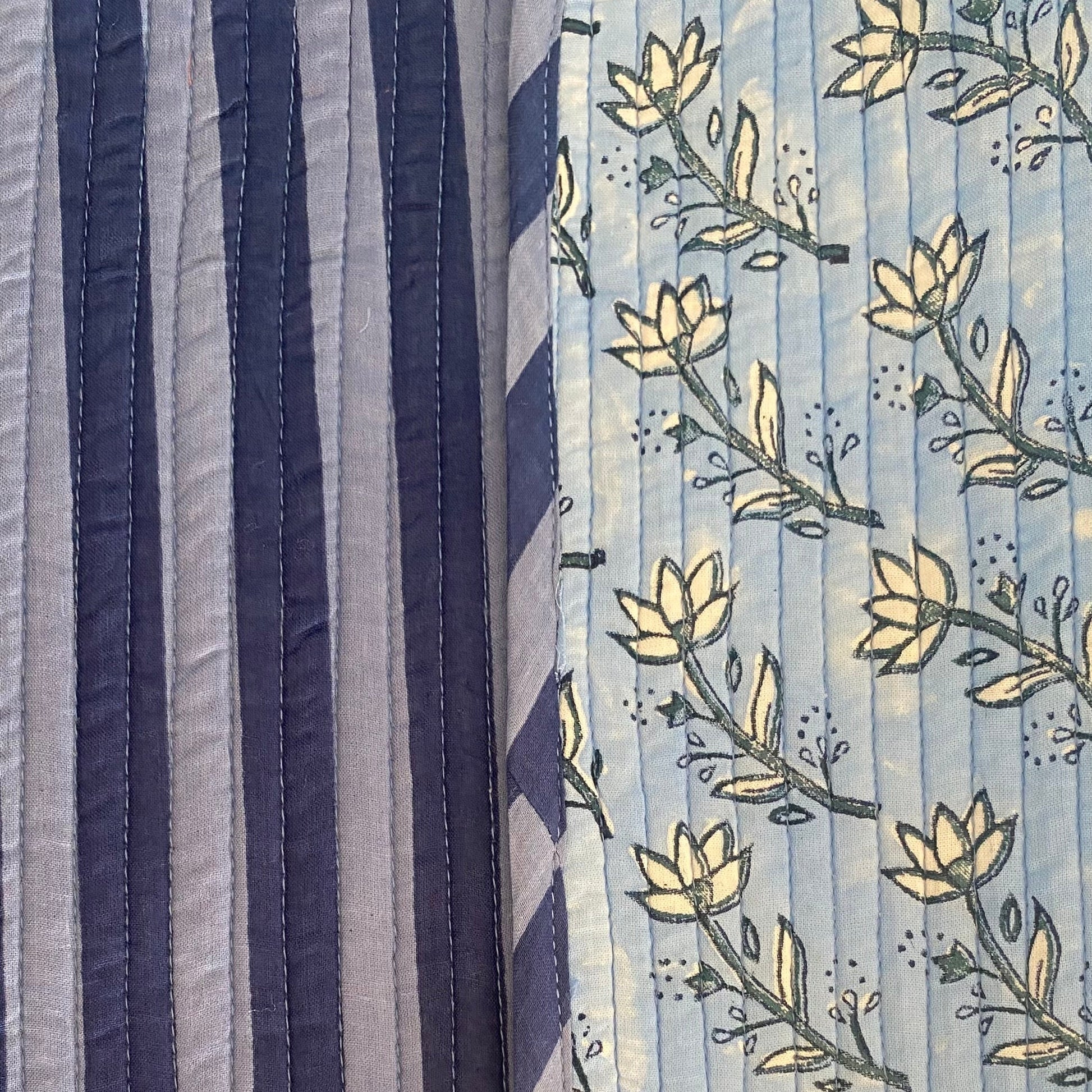 Combinación de prints romántico de flores azules y raya estrecha en 2 tonos azules Súper original.