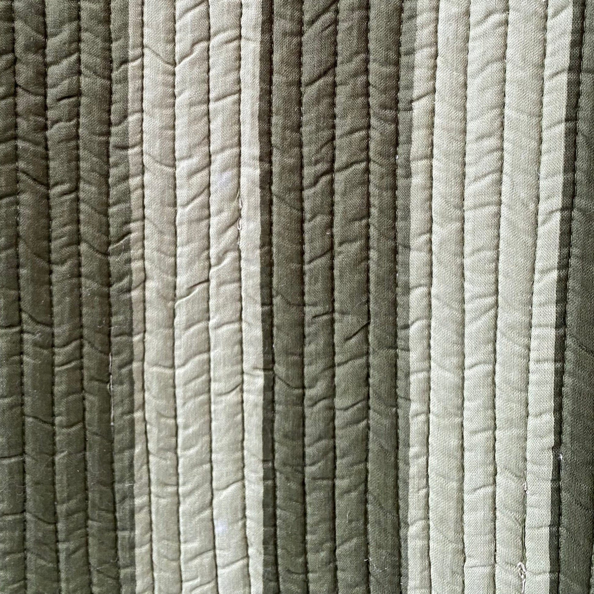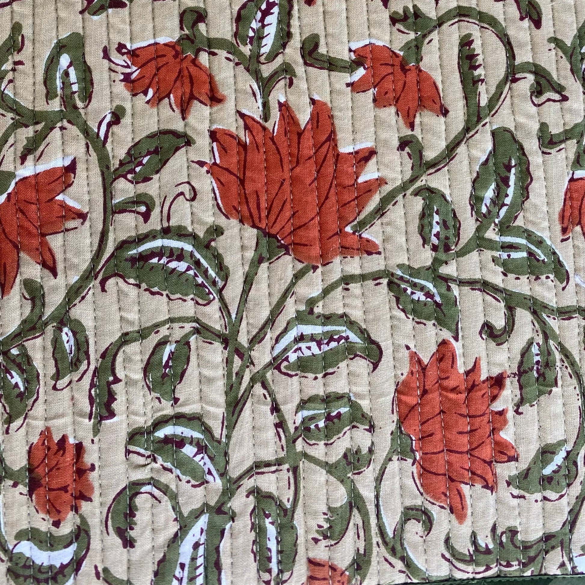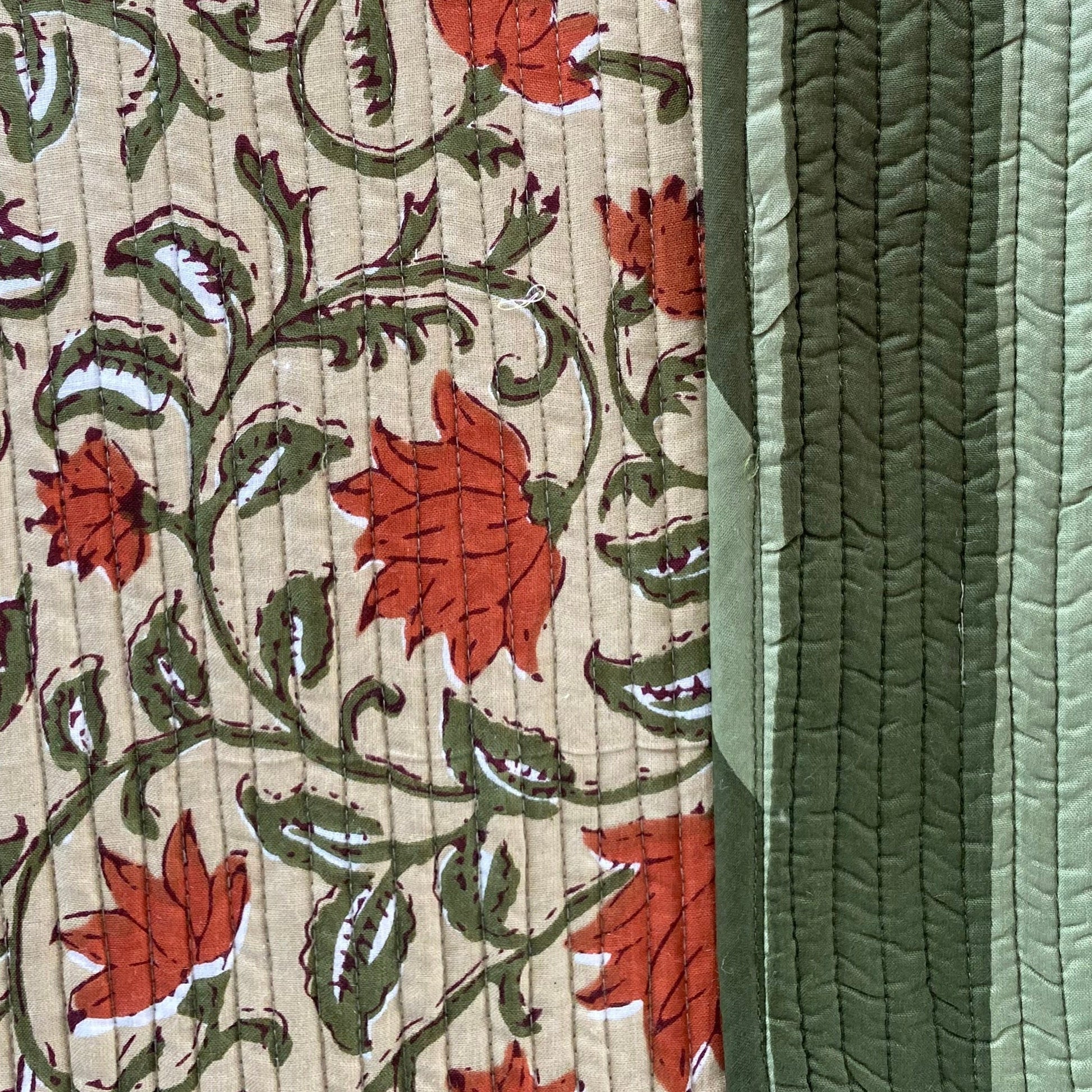 Combinación de print rayas anchas en tonos de verde, y flores caldera .
